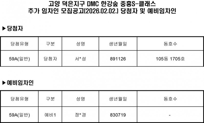 고양덕은 임대 홈페이지 추가 임차인 모집공고(2026.02.02.)_당첨자 및 예비임차인